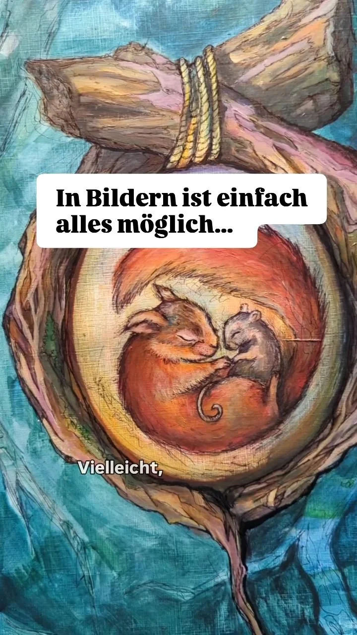 Die Idee für dieses Bild kam aus einem sehr persönlichen Moment: Ich war gerade dabei zu spüren, dass ich – mit all meiner Fülle, meiner Verspieltheit, meinen vielen Ideen – bereit bin, aus meinem "Ei" zu schlüpfen. Raus aus dem Rückzug, rein in die Sichtbarkeit. Das Eichhörnchen ist hier nicht irgendeines. Es ist ein Drachen-Eichhörnchen – ein Wesen zwischen Welten, verspielt, mutig, anders. Es steht für das Vertrauen in das, was in dir steckt, auch wenn es noch nicht alle sehen.