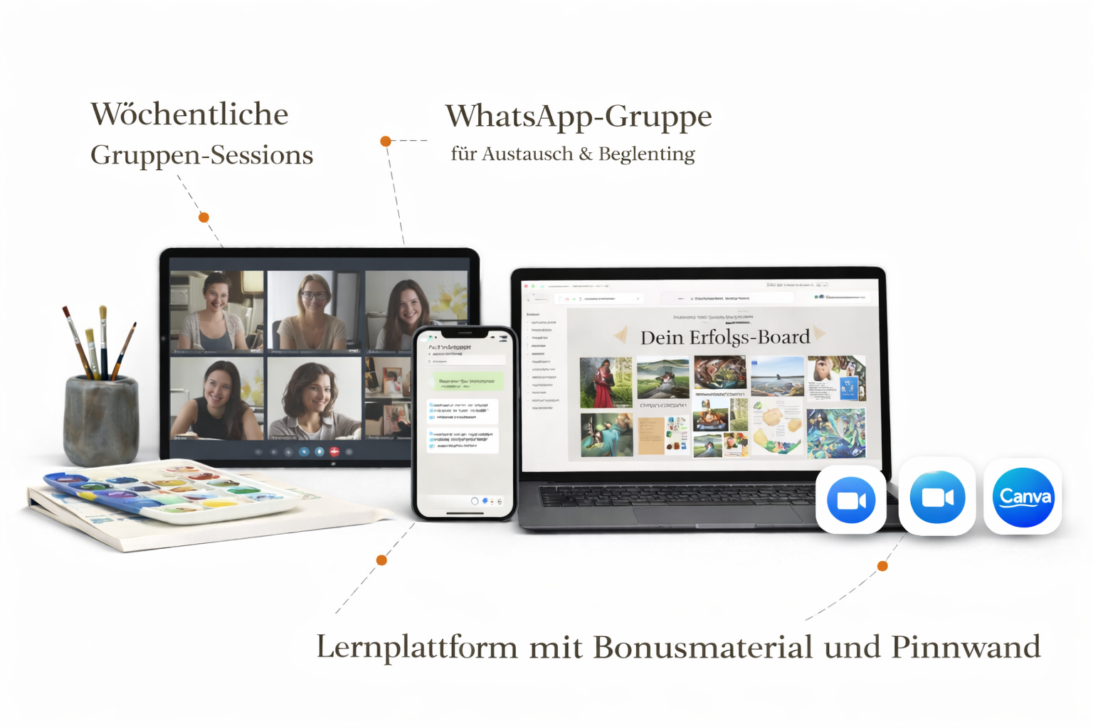 Und wenn du spürst, dass du weitergehen möchtest, findest du deinen Platz – im 1:1 oder in der kreativen Gruppe des Online-Ateliers.
